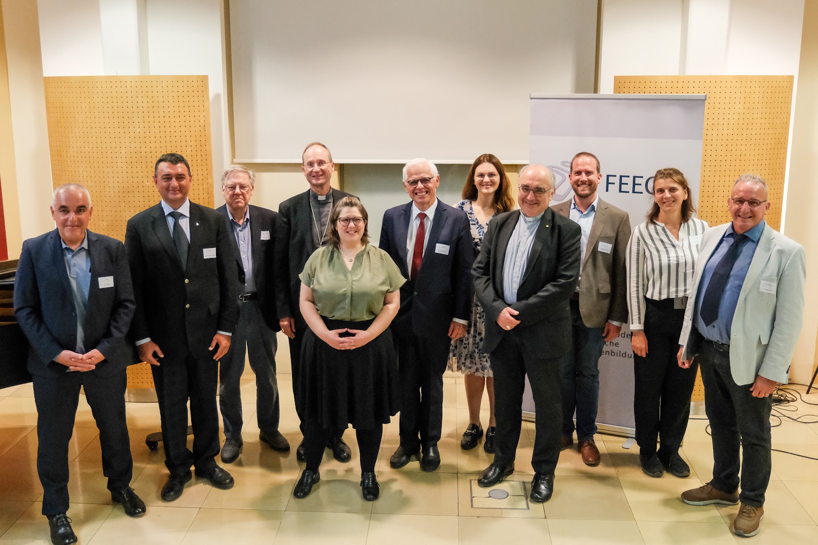 von links nach rechts: FEECA-Präsident Hubert Petrasch, Referatsbischof Wilhelm Krautwaschl, Weihbischof Stephan Turnovsky, COMECE-Vertreter Emiglio Dogliani, Videobotschaft Othmar Karas, Präsidium der FEECA, Präsidium und Delegierte der FEECA