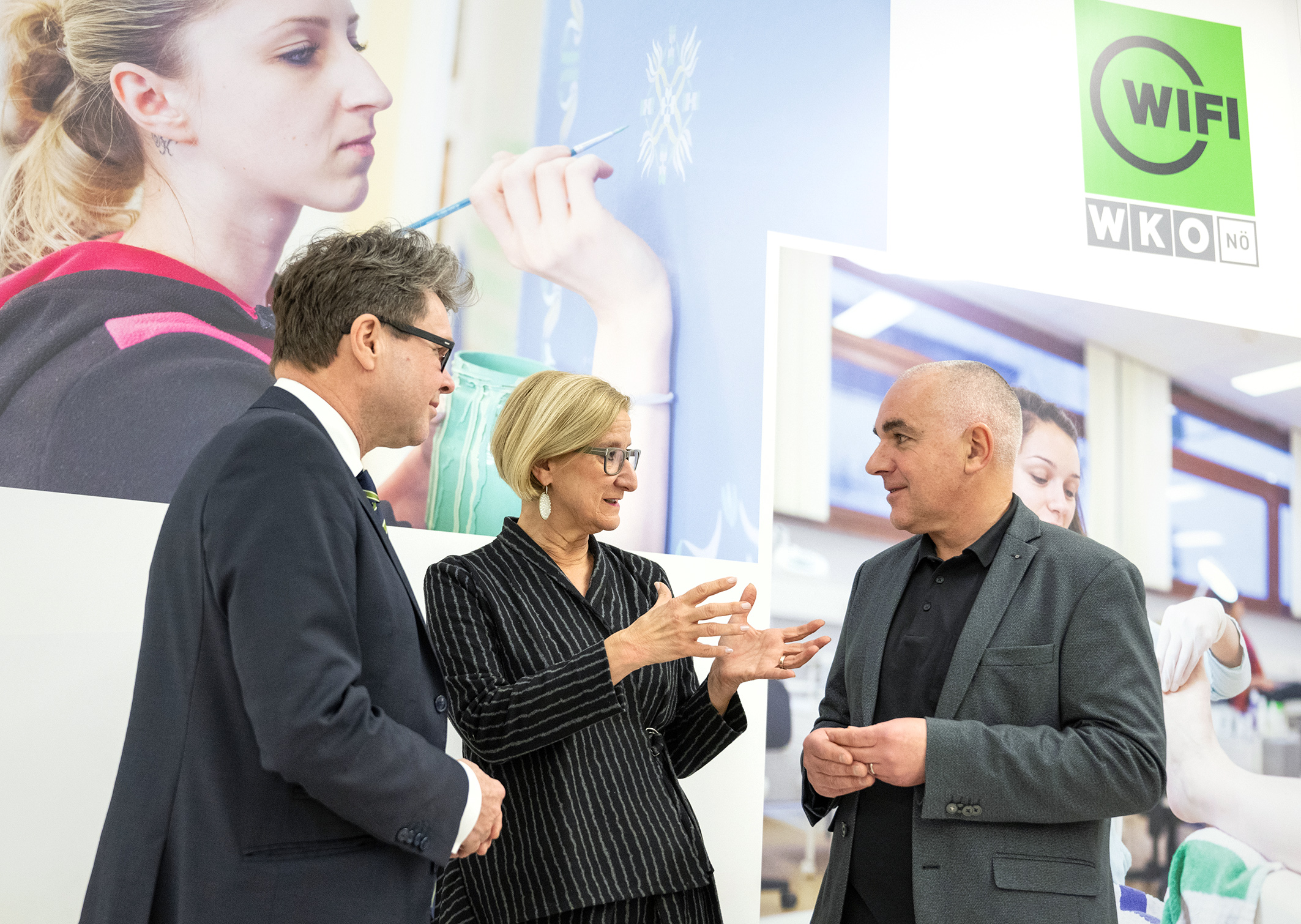 Bild rechts: © NLK Pfeffer: LH Johanna Mikl-Leitner, BM Martin Polaschek und KEBÖ-Vorsitzender Bernd Wachter (von links nach rechts)